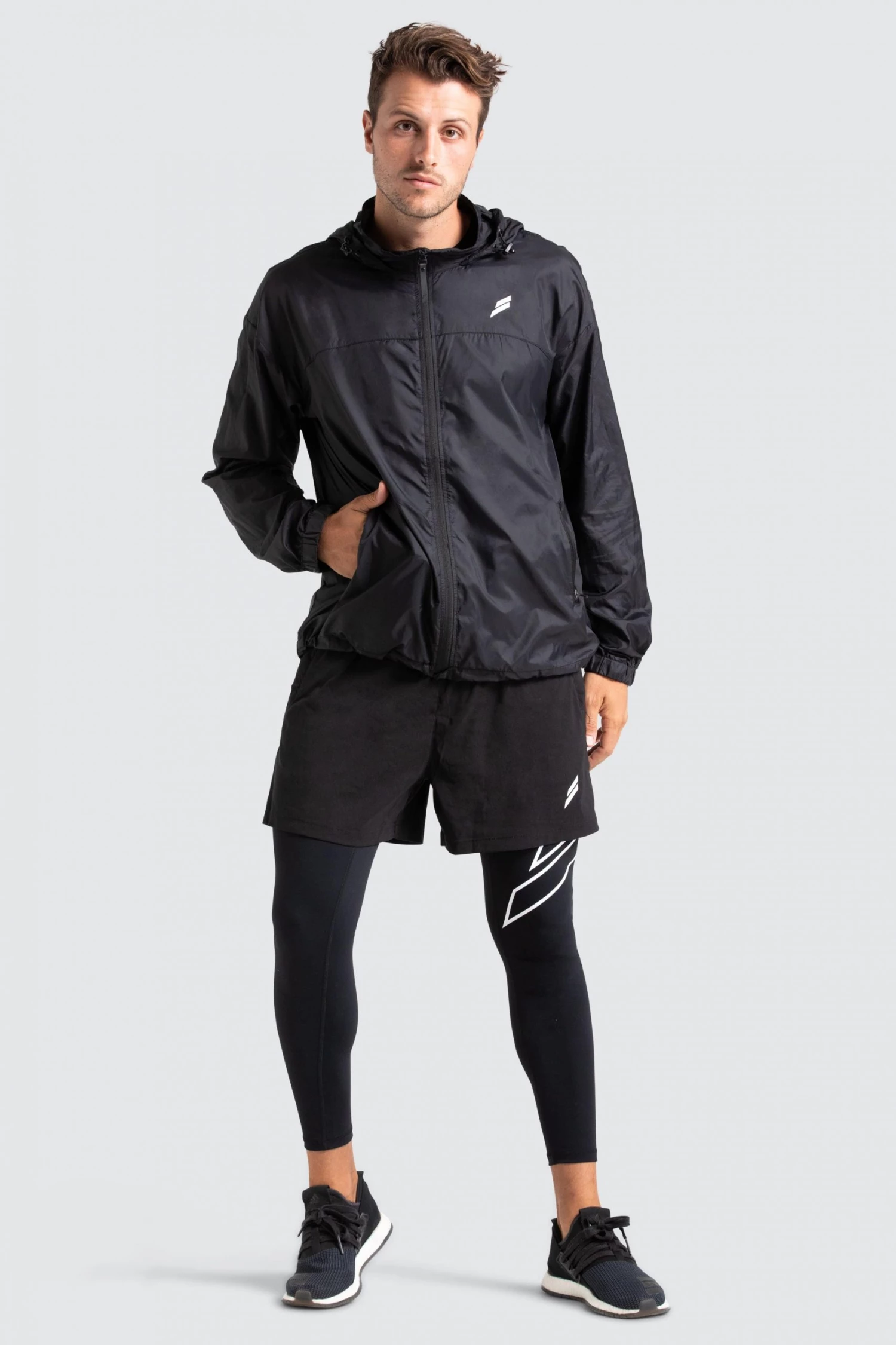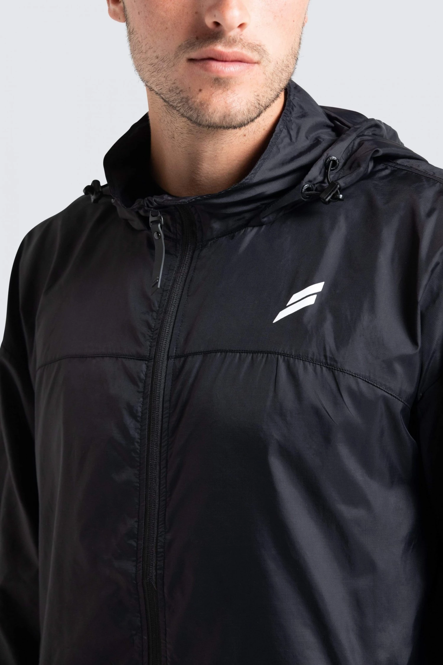 Model is 6″0 and wears a Large Marked Running Jacket.